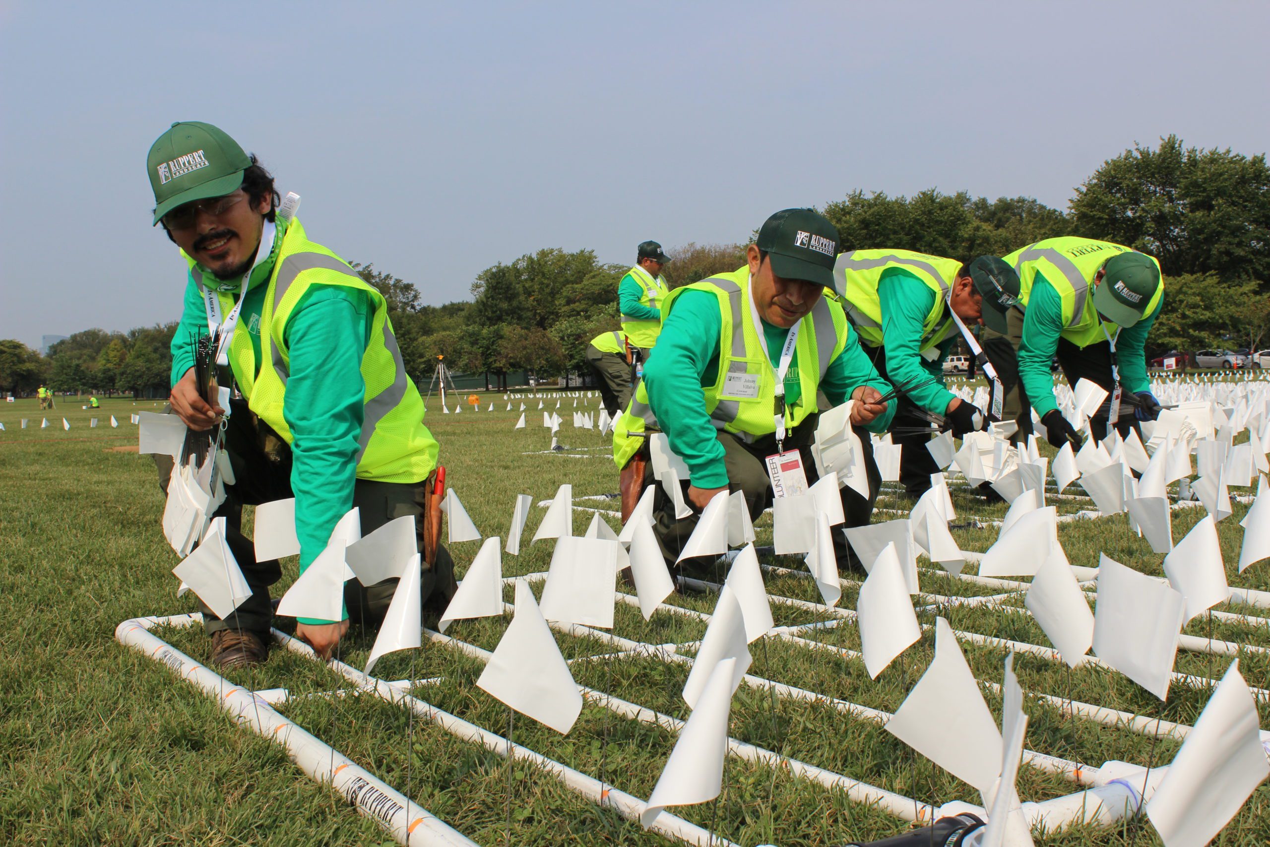 Ruppert Landscape was proud to support this project, at no cost, by hand-installing the commemorative flags. To help bring the artist’s vision to life, we used a combination of aerial mapping and design software to create a grid that encompasses the National Mall. We created a grid tool made out of PVC pipe to ensure symmetry and precision during installation. There are 143 sections (most of which are 60’ x 60’), divided by 8’ paths that span 22 acres. Within each section, our teams placed 5329 flags. In total, Ruppert donated over 1,200 labor hours to bring this project to fruition, with the help of over 100 team members from 10 local branches working throughout the three-day install.